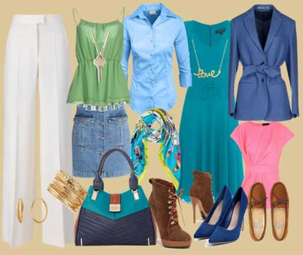 Голубые и бирюзовые тона в зависимости от насыщенности варьируются от бледного до резкого контрастного. В комплект к ним можно подбирать белые и пастельные тона от нежно-желтого до легкого зеленого. Яркими получатся комбинации с синим, оранжевым, красным и коричневым.Универсальный комплект гармонично сочетающейся одежды в голубых тонах для всех случаев жизни