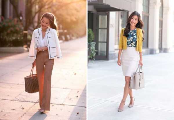 Smart-Casual для женщин. Рубашки не обязательно застегивать на все пуговицы, а рукава и вовсе не должны быть строго спущенными. Пиджаки и жакеты можно оставить расстегнутыми, выправив воротник рубашки поверх воротника пиджака. Стиль предполагает ношение в офис джинсов, но их цвета не должны быть «уличными». Нужно остановиться на черных или белых, зауженных к низу и длиной по щиколотку. Обувь — каблуки, мокасины, но только не кеды.