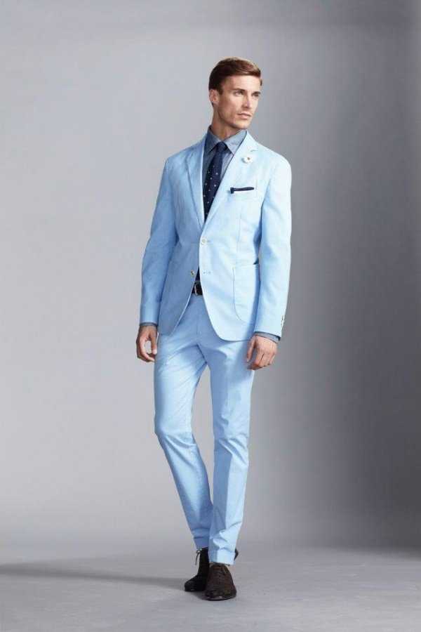 Летний вариант мужского костюма может быть изготовлен из легких тканей типа лен. Цвет костюма в летний период 2018 года можно выбрать как светлый, цвета слоновой кости, так и синий. Можно сыграть на контрасте, выделив одну часть одежды: пиджак или брюки, ярким акцентом.