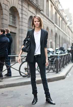 При наличии высокой застежки пиджак может носиться без блузки, но это скорее исключение из принятых правил стиля. Лучше всего подобрать подходящую блузу, которая должна контрастировать по цвету с пиджаком и иметь отложной воротник, который дополнит образ и создаст натуральный классический облик. Современная мода, идущая на упрощение, позволяет надевать под пиджак футболку или майку с небольшим вырезом горловины, обязательно отличающуюся по цвету от пиджака.