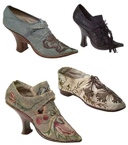 Самые же высокие каблуки носили в годы Людовика XIV. В 19 веке туфли сменяются кожаными ботинками на шнурках, с каблучком средней высоты, застежками и меховой отделкой. Обувь в 20 веке становится отличительным признаком социального положения. Аристократы носили узкую остроносую обувь на фигурном каблуке.